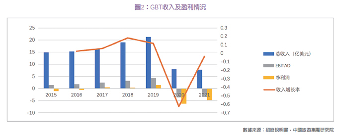 疫情前GBT收入逐年上升,受新冠疫情沖擊收入利潤(rùn)大幅下滑,近期業(yè)績(jī)逐漸修復(fù)。2015-2019年GBT收入由14.88億美元增長(zhǎng)至21.19億美元,連續(xù)兩年增速超10%,2019年總交易量(TTV)達(dá)到新高290億美元,較去年增長(zhǎng)9.8%,從盈利情況看,GBT 在2017年實(shí)現(xiàn)扭虧為盈,凈利潤(rùn)0.43億美元,2019 年凈利潤(rùn)1.34億美元,凈利率由2.68%提升至6.32%。2020年受新冠疫情影響,收入下跌62.58%至7.93億元,EBITAD和凈利潤(rùn)轉(zhuǎn)負(fù),虧損6.18億美元。2021 年受收益率下降影響,總收入下降4%,雖仍未恢復(fù)盈利但較去年減虧1.43億美元。受國(guó)際旅行復(fù)蘇影響,2022年二季度GBT收入同比增長(zhǎng)217%至4.86億美元,恢復(fù)至2019年的64%,凈虧損縮減為200萬(wàn)美元。2022年上半年收入恢復(fù)至2019年同期的76%, 預(yù)計(jì)下半年交易業(yè)務(wù)復(fù)蘇將推動(dòng)GBT收入恢復(fù),全年交易量將恢復(fù)到2019年的74%,全年收入預(yù)期達(dá)到18.5億美元。