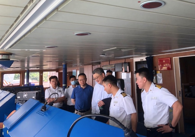 王總參觀了“鼓浪嶼”號公共區(qū)域,實(shí)地探訪了駕駛室、集控室、垃圾處理區(qū)域等船員工作生活區(qū)域,與一線船員深入了解船舶設(shè)施、設(shè)備的各項(xiàng)運(yùn)營及維護(hù)情況。
