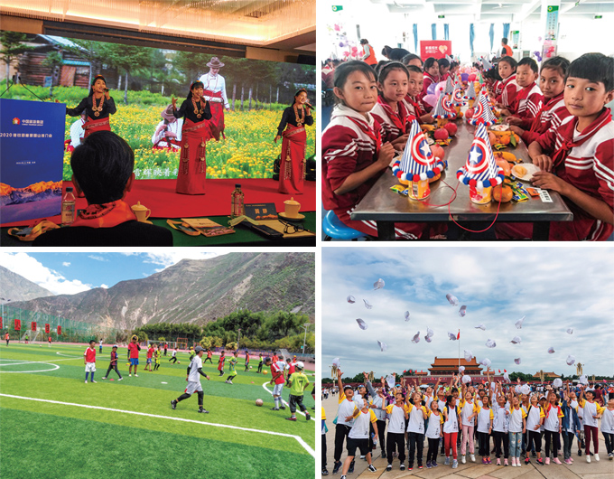 圖1-4:2020德欽縣梅里雪山推介會;「星旅家庭成長計劃」公益項目,為孩子們打造學(xué)習(xí)生活空間;集團幫扶的德欽三小操場;中國旅游集團希望之星成長營