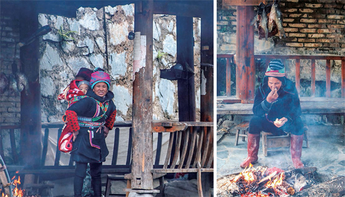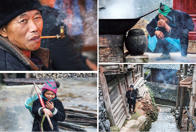 圖1-4:這樣吸煙,見過沒有?;老奶奶站在那里笑呵呵地望著我們;老奶奶在用傳統(tǒng)方法燒火;肩挑東西的侗家婦女很常見