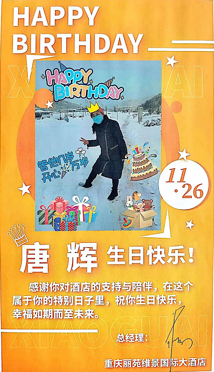 象往常一樣,我還在為采購的事情忙的焦頭爛額,突然手機(jī)傳來微信的提示音,還以為又有什么工作要做,打開微信界面的一剎那,我瞬間淚目。我的娘家——重慶麗苑維景國際大酒店,并沒有忘記遠(yuǎn)在崇禮支援冬奧的我,專門為我錄制了一段生日祝福視頻,制作了一張生日海報(bào),酒店總經(jīng)理肖梅總還親筆為我送上祝福。大家的祝福與鼓勵(lì)讓我心里暖暖的,有“娘家人”為我撐腰,我定然“雄起”!