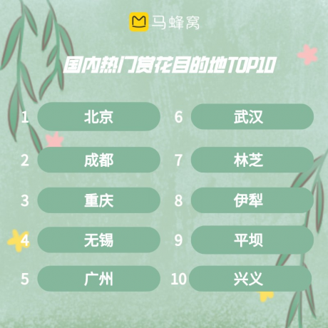 春風(fēng)送暖,全國各地的鮮花次第盛開,“賞花”也被眾多旅行者提上了日程。近一周以來,馬蜂窩站內(nèi)“踏青賞花”相關(guān)搜索熱度上漲50%。為了迎接賞花季的到來,馬蜂窩推出了覆蓋近百個目的地的春季“全國賞花地圖”攻略,無論長途旅行或是周邊踏青,都可以從該攻略中獲得實(shí)用參考。