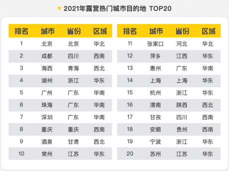 來自一線及新一線城市的消費(fèi)者是露營的主要客源,對他們來說,露營不僅僅是換個(gè)地方睡覺,更是逃離喧囂生活的心靈棲息。其中,北京、成都、上海、廣州包攬露營客源地前四,對露營總游客量的貢獻(xiàn)超過三成。