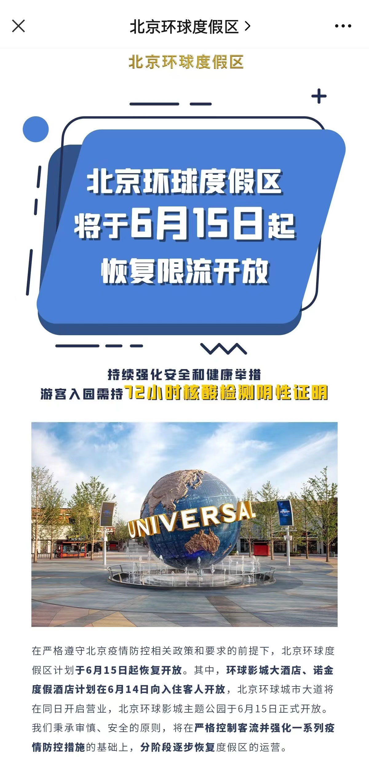 北京環(huán)球度假區(qū)將于6月15日起按照每日75%的限流比例恢復開放。