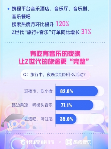 影音房之外,旅行中的音樂場景也頗受Z世代群體歡迎,6月份攜程平臺(tái)音樂酒店、音樂廳、音樂餐吧搜索熱度環(huán)比上月同期提升120%,Z世代“旅行+音樂”相關(guān)訂單同比增長31%。