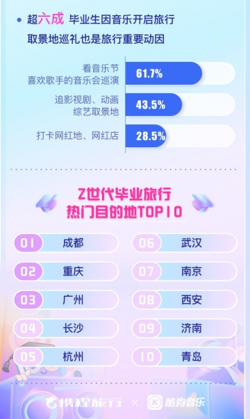 6月23日,攜程旅行聯(lián)合酷狗音樂發(fā)布《Z世代畢業(yè)生音樂旅行方式洞察報(bào)告》,報(bào)告顯示,截至6月22日,2022年高中及大學(xué)生群體畢業(yè)旅行熱度同比提升28%,人均消費(fèi)提升21%。主題化、體驗(yàn)型的旅行方式愈加受到年輕一代歡迎,打“飛的”去陌生城市看演唱會(huì)、拔草心儀影視作品的取景地、因一曲音樂到他鄉(xiāng)尋找人間煙火——“00后”們畢業(yè)旅行的儀式感被拉滿、“旅行+音樂”的方式也更加多元、有趣。