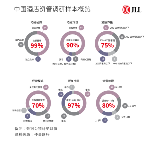 本次調(diào)查針對近百位酒店業(yè)主進行了問卷調(diào)查,獲得了大量、豐富、時間跨度涵蓋疫情前后(2019年和2021年)的13項重要的酒店運營指標(biāo)和資產(chǎn)管理指標(biāo)。參與調(diào)查的酒店遍布全國各主要區(qū)域,大部分為規(guī)模在200至400個房間,提供全服務(wù)的國際或國內(nèi)連鎖品牌酒店,其中70%為全權(quán)委托管理,自營和第三方管理各占17%,特許經(jīng)營占5%,可以說是一次對中國酒店行業(yè)資產(chǎn)管理水平的全景描摹。