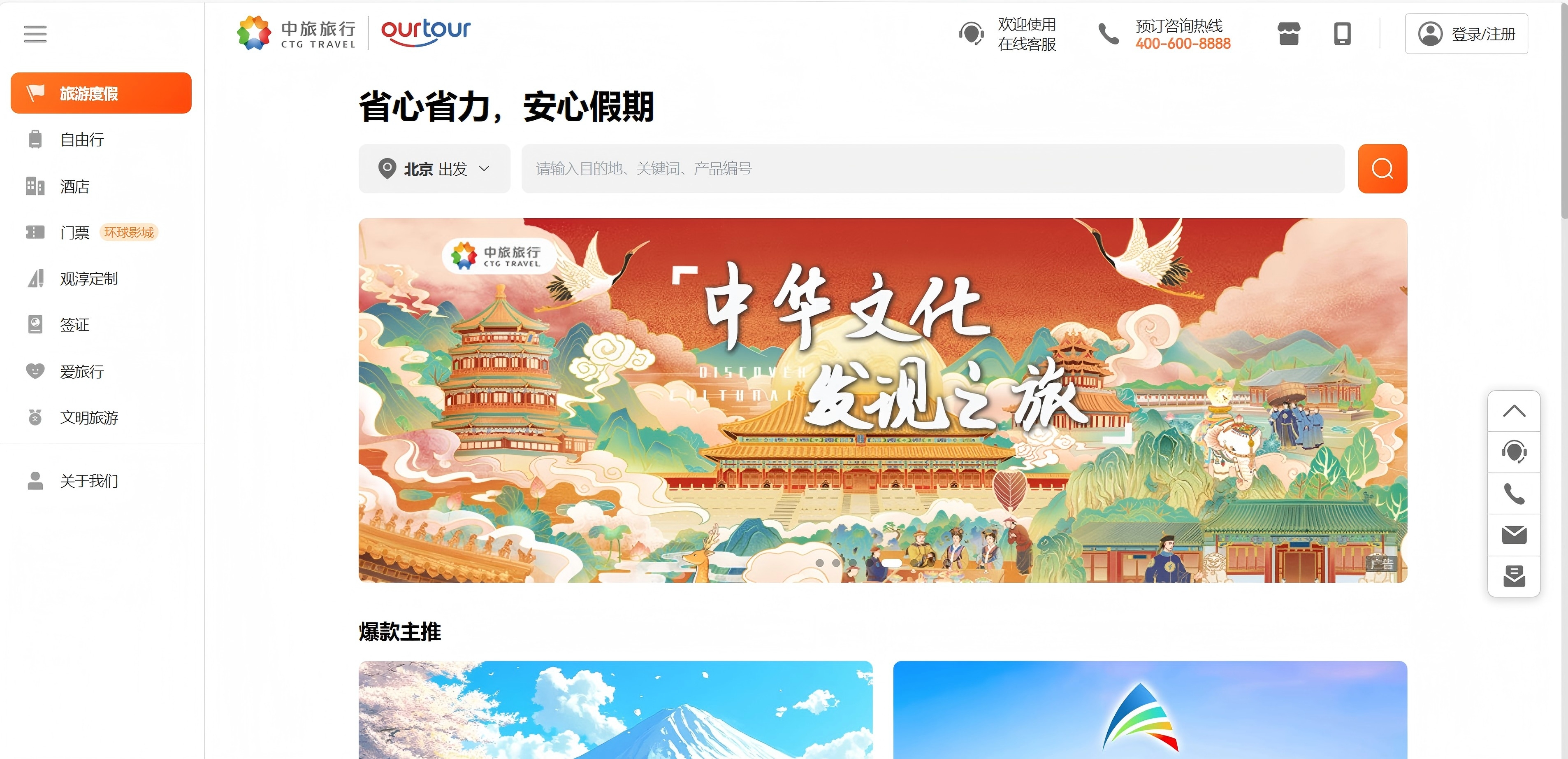 “中旅旅行”線上銷售平臺包括PC網(wǎng)(www.ourtour.com)、App和小程序,提供國內(nèi)及出境跟團游、自由行、定制游、郵輪、機票、酒店、簽證等旅游產(chǎn)品一站式服務(wù)?!爸新寐眯小睂⒅新谩谩⒏壑新萌笃放频膬?yōu)質(zhì)旅游資源進行整合,進行統(tǒng)一的展現(xiàn)和銷售;整合集團內(nèi)維景酒店、星旅郵輪、景區(qū)、旅游金融等優(yōu)質(zhì)資源,升級具有核心競爭力的自有產(chǎn)品體系,滿足消費者的美好出行需求。